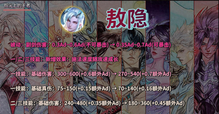 另外,一技能的伤害和真伤,二技能和三技能的伤害,都是削弱了基础伤害和成长伤害,但是用AD加成进行了补偿。