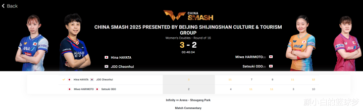 北京时间10月1日,WTT北京大满贯女双1/8决赛,张本美和/大藤沙月2-3不敌早田希娜/朱芊曦,五局比分:4-11、11-7、11-9、3-11、10-12。张本美和/大藤沙月在大比分0-1落后的情况下连扳两局反超,但后面两局又被早田/朱芊曦碾压,最终张本/大藤逆转失败止步16强。