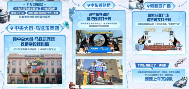 而如果你是个同时关注尔滨和《和平精英》的双料玩家,还能发现,这个冬天可不只有线上的游戏整活,在哈尔滨的线下,也将出现“和平精英打卡点”,就等着今年的“南方特种兵”和东北原住民们在这些经典景点聚齐,来个“线下面基”。